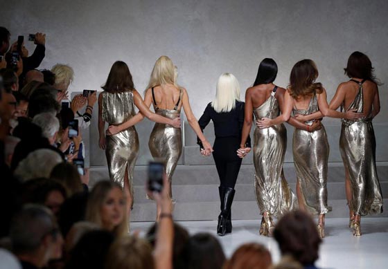 وقد ظهرت جميلات عالم الأزياء في العرض الأخير لدار "فيرساتشي" خلف ستارة كبيرة، اُفتتحت ليظهرن خلفها وهن يقفن على مدرجات صغيرة، ويرتدين فساتين ذهبية مثيرة. وانتهى العرض بظهور دوناتيلا التي سارت على المنصة مع العارضات الخمس، اللاتي حرصن على أن يمسكن أيدي بعضهن البعض، في لحظة استثنائية قد لا تتكرر في وقت قريب.