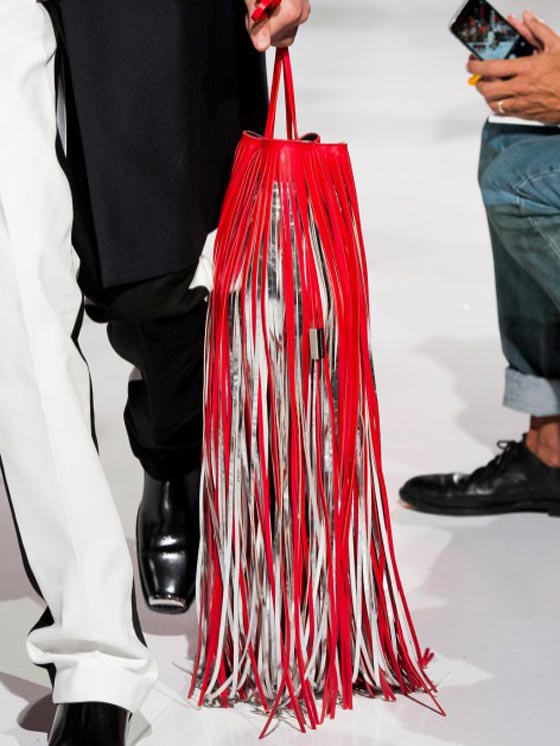 - حقائب دار كالفن كلاين ترجمت طابعها العصري بالألوان المشرقة والشراريب الطويلة جداً التي تصل حتى مستوى الأرض.