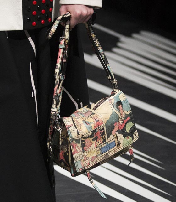 - حقائب برادا تزيّنت بالرسوم الكرتونية التي ظهرت أيضاً على أزيائها الخاصة بالربيع والصيف المقبلين.
