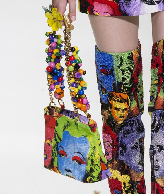 - حقائب فرساتشي تزيّنت برسومات لشخصيّات هوليوودية شهيرة أمثال ماريلين مونرو وجايمس دين. كما دخل عليها الخرز الكبير الملوّن لإضفاء المزيد من اللمسات المرحة عليها.