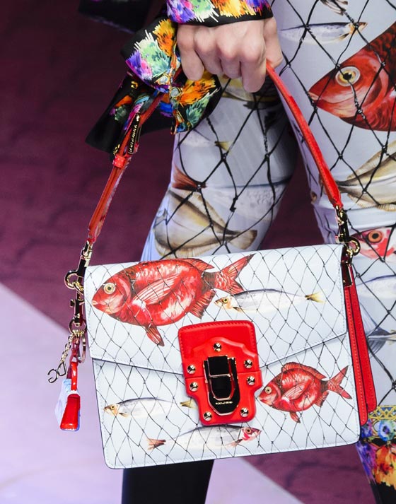 - الطبعات المبتكرة زيّنت تصاميم حقائب دار دولتشي أند غابانا التي تزيّن بعضها بالأسماك والبعض الآخر بطبعات الخضار والفاكهة.