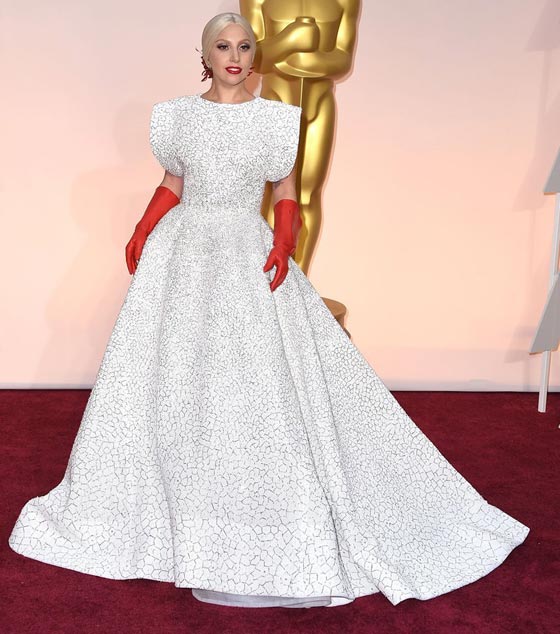 لايدي غاغا- الثوب الأبيض الذي اختارته لايدي غاغا من عز الدين عليّة لحضور حفل أوسكار 2015 تطلّب تنفيذه مشاركة 25 شخص عملوا بشكل دؤوب طوال أسبوعين لتنفيذ هذا التصميم الذي ترافق مع قفازات جلديّة حمراء.