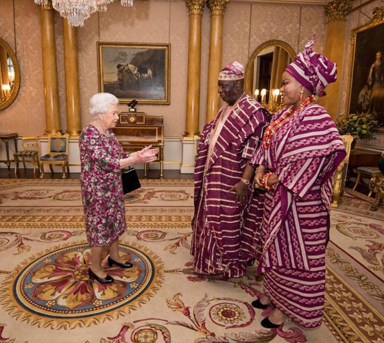 ارتدت الملكة البريطانية اليزابيث الثانية زيا غير مألوف خلال استقبالها للسفير النيجيري وزوجته في لندن. (فستان خمري اللون مزين بزهور مختلفة). وجرت العادة أن ترتدي الملكة البريطانية فساتين بلون واحد هادئ تتفق مع قواعد الإتيكيت، حاولت الملكة التكيف مع ملابس ضيوفها – السفير وزوجته اللذين قدما بملابس إفريقية تقليدية باهية الألوان.