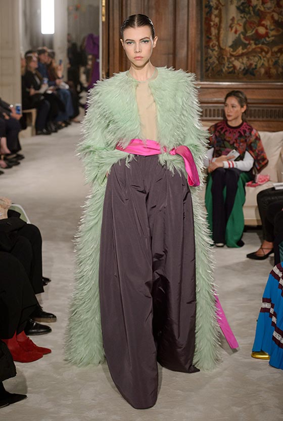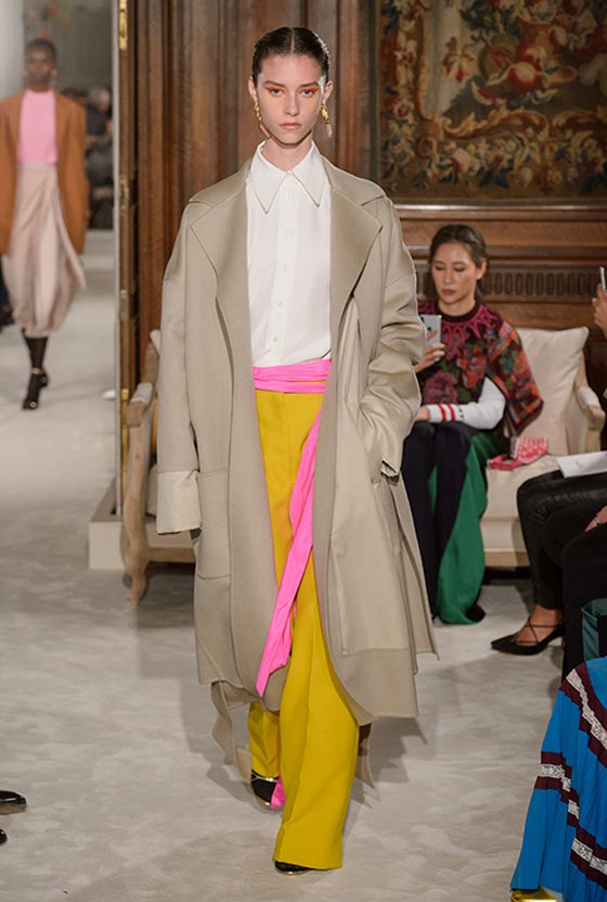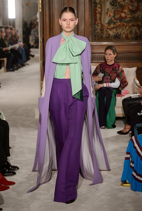 خلطات لونيّة متوازنة رغم جرأتها، اعتمدها المدير الإبداعي في الدار بييرباولو بيتشيولي فرأيناه يجمع بين الوردي والخردلي والأبيض والبنفسجي أو بين الوردي والأحمر والبيج.. بأناقة عصرية لافتة. وهو اعتمد على الأحجام الكبيرة، والكشاكش الضخمة، والأكمام المنتفخة، والسراويل الواسعة، والأحزمة العريضة ليقدّم رؤيته الخاصة لموضة تفرض نفسها بكلّ ثقة.
