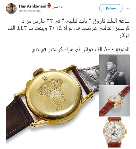 يستعد دار "كريستيز" للمزادات في دبي، لطرح ساعة ذهبية نادرة للبيع كان يمتلكها ملك مصر السابق فاروق. صنعت الساعة من ماركة "باتيك فيليب 1518" في عام 1944 وتحمل نقشا لتاج المملكة المصرية السابقة. وتعد الساعة واحدة من بين 281 ساعة فقط من هذا الطراز أنتجتها شركة الساعات السويسرية الفاخرة، ومن المتوقع أن يتراوح سعرها ما بين 400 إلى 800 ألف دولار أمريكي.