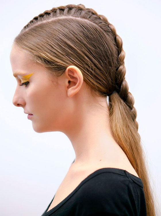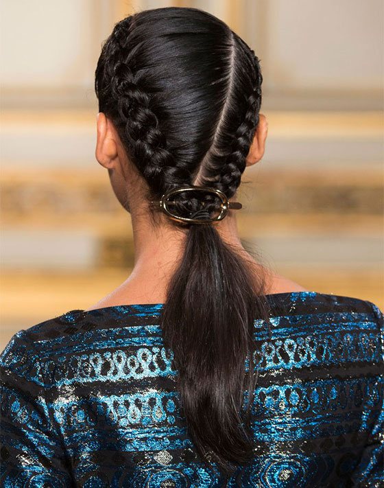 4- يمكنكِ تزيين تسريحة ذيل الحصان بضفيرة عامودية تبدأ من أعلى الرأس وتنسدل إلى الخلف.