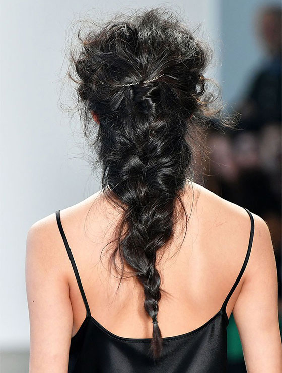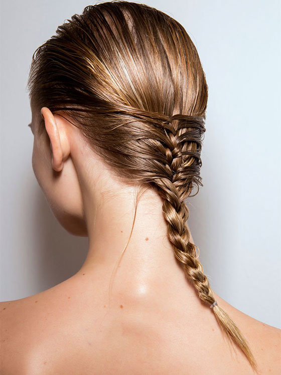 5- غطّي شعركِ بطبقة من الجل قبل تسريحه إلى الخلف على شكل ضفيرة، للحصول على إطلالة الشعر الرطب.