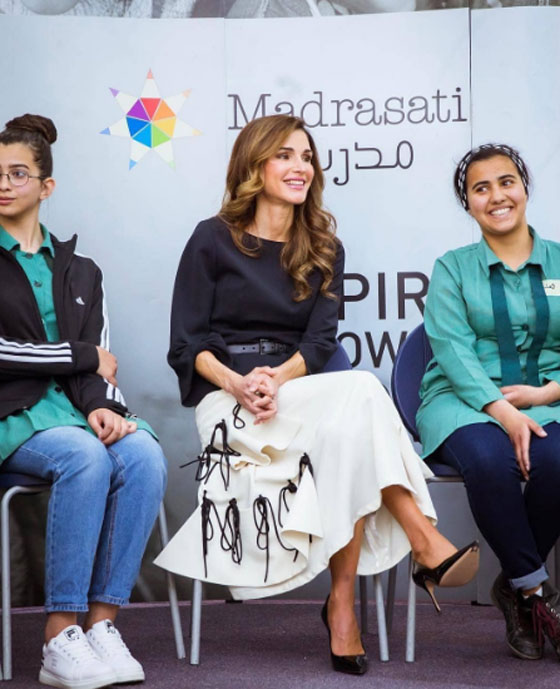 5 - تحرص الملكة رانيا على اعتماد بعض اللمسات المبتكرة عند اختيارها تصاميم كلاسيكية من حيث الأزياء والألوان، كما في إطلالتها التي تألّفت من تنورة طويلة بيضاء تزيّنت بشرائط سوداء وتمّ تنسيقها مع بلوزة سوداء وحزام جلدي باللون نفسه.