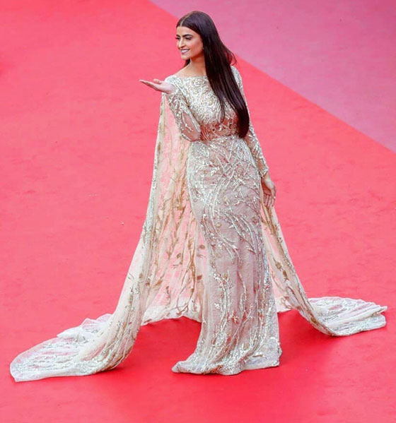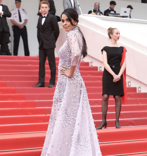 - تألّقت الممثلة الهندية ماليكا شيرويت ثوباً من الدانتيل الرمادي تميّز بتطريزه المبتكر على شكل بتلات أزهار ثلاثيّة الأبعاد. وقد حمل توقيع دار طوني ورد