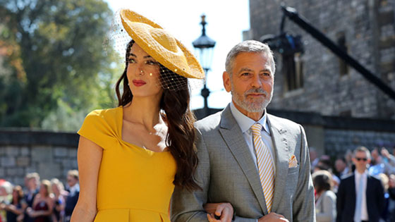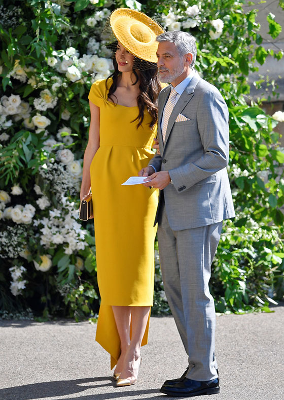 نسّقت أمل ثوبها مع قبعة باللون نفسه، وحذاء باللون الذهبي وحقيبة "كلاتش" بلوني الأسود والذهبي. أما جورج كلوني فاختار بدلة باللون الرمادي الفاتح وربطة عنق بلوني الرمادي والأصفر لتتناسق مع إطلالة زوجته المشرقة.