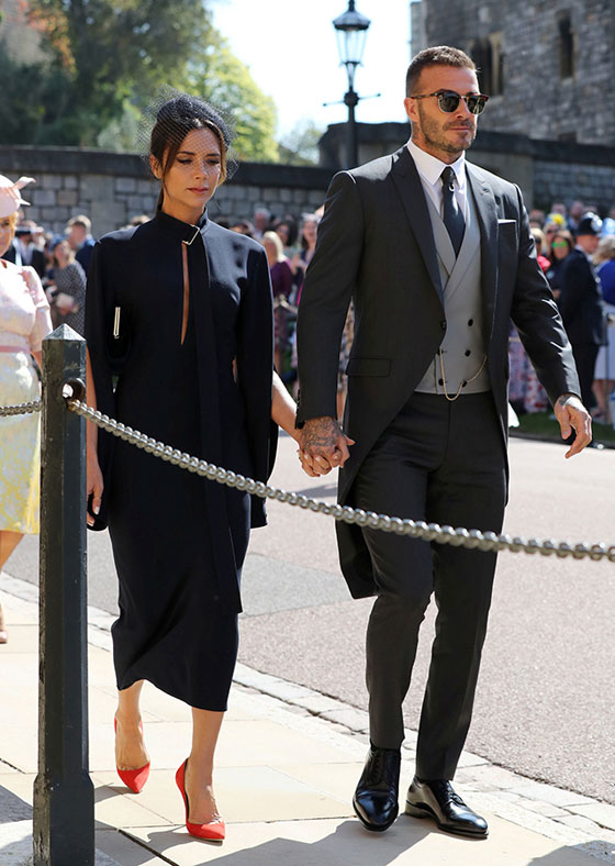 - اعتمدت مصممة الأزياء فيكتوريا بيكهام إطلالة باللون الكحلي تحمل توقيعها فيما اختار زوجها لاعب كرة القدم البريطني دايفيد بيكهام توكسيدو بألوان الأسود والرمادي. واللافت أن إطلالة فيكتوريا جاءت شبيهة إلى حدّ بعيد من حيث اللون والتصميم بالإطلالة التي سبق أن اعتمدتها في زفاف الأمير ويليام من كايت ميدلتون.