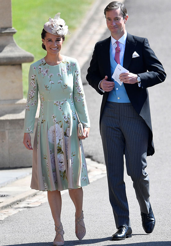 - وصلت بيبا ميدلتون شقيقة دوقة كامبريدج كايت ميدلتون إلى الزفاف الملكي برفقة زوجها جايمس ماثيو. وقد اختارت التميّز بطراز الأناقة الإنكليزية من خلال ثوبها الأخضر الفاتح المطبّع بالأزهار.