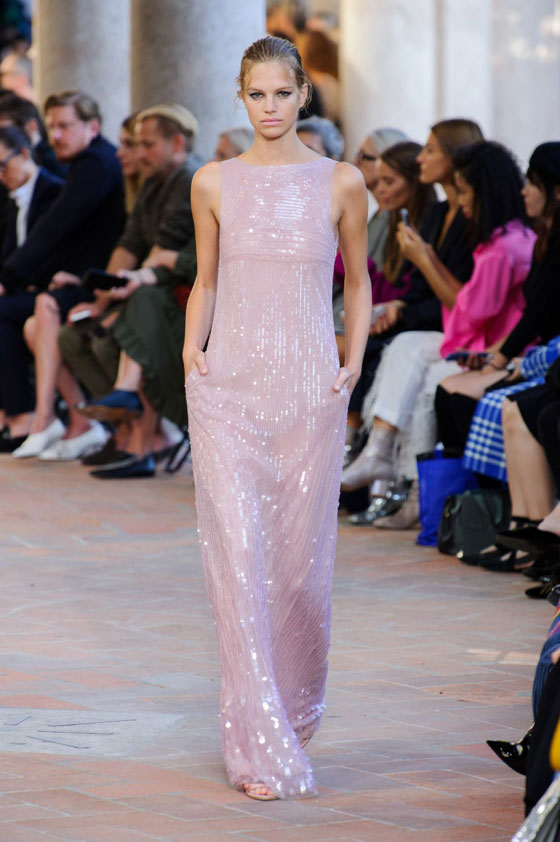 - لإطلالة ناعمة ومشرقة في الوقت نفسه، يمكن اختيار ثوب طويل من الترتر بلون باستيلي وقصة بسيطة. استوحي من تصاميم دار Alberta Ferretti لمناسبات هذا الصيف.