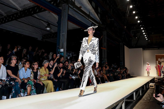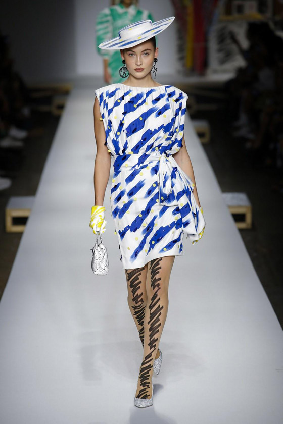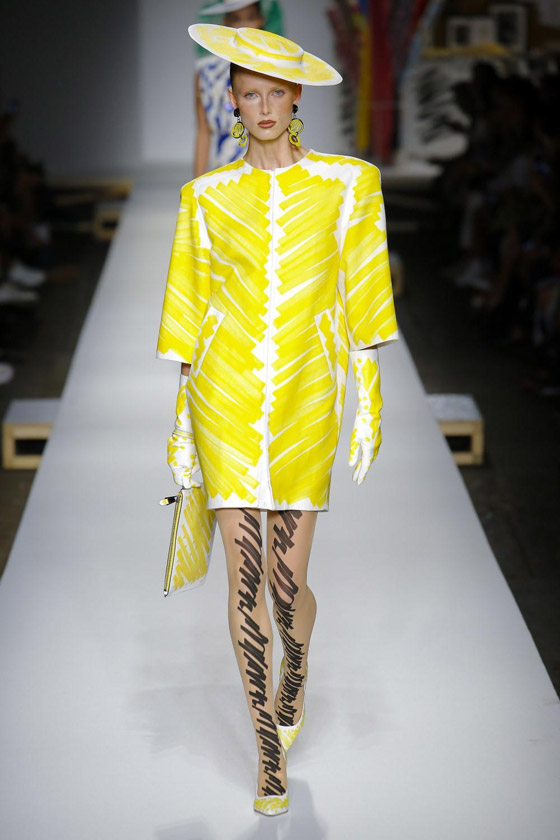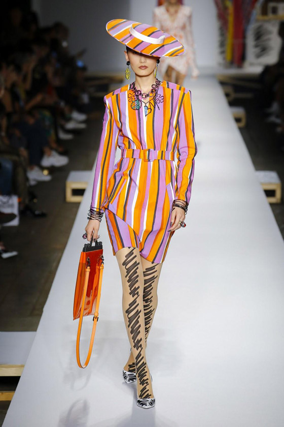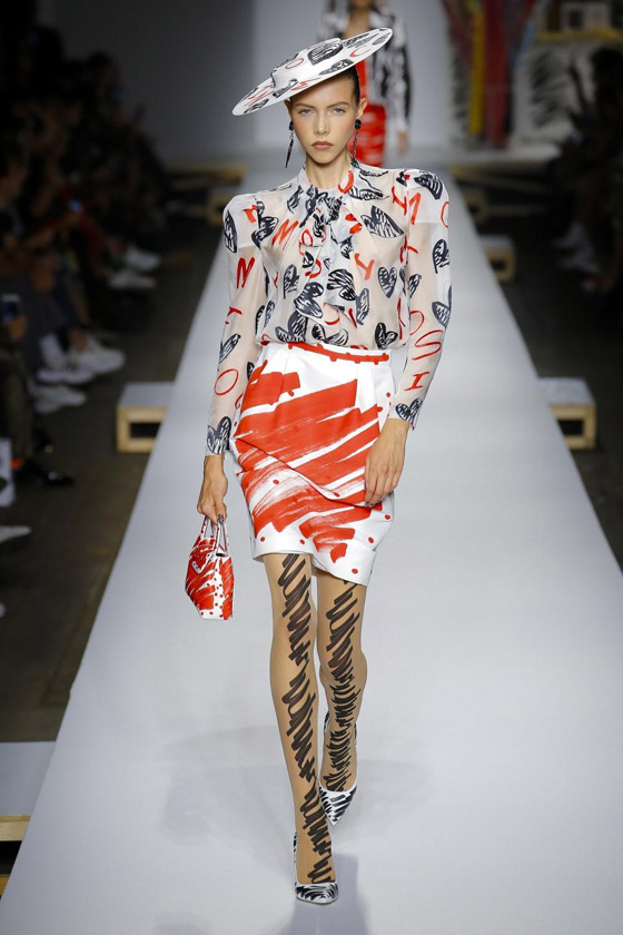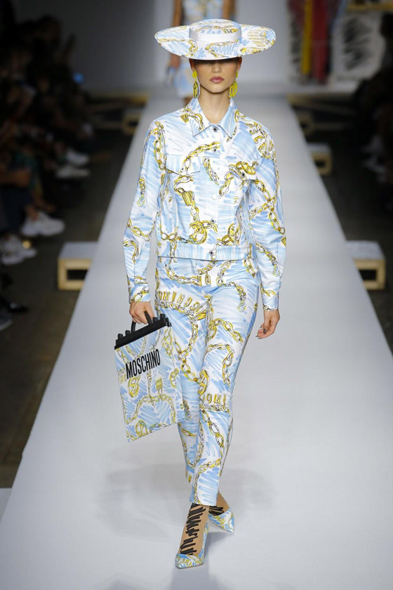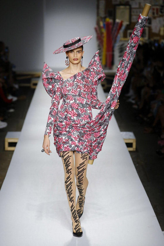 استحضر المصمم في ديكور عرضه أجواء مشغل المصمم الفرنسي الراحل إيف سان لوران في ثمانينيّات القرن الماضي. وقدّم تصاميم مستوحاة من تلك التي كان يعتمدها هذا المصمم الشهير وأبرزها الأثواب ذات القصّات الهندسيّة والسترات ذات الأكتاف المدعّمة. دون أن ننسى التفاصيل الشبابيّة الأيقونيّة الخاصة بدار Moschino وأبرزها طبعة السلاسل، الأزياء المصنوعة من الدنيم، رسمة الدبدوب، والحقائب المصنوعة من القش.