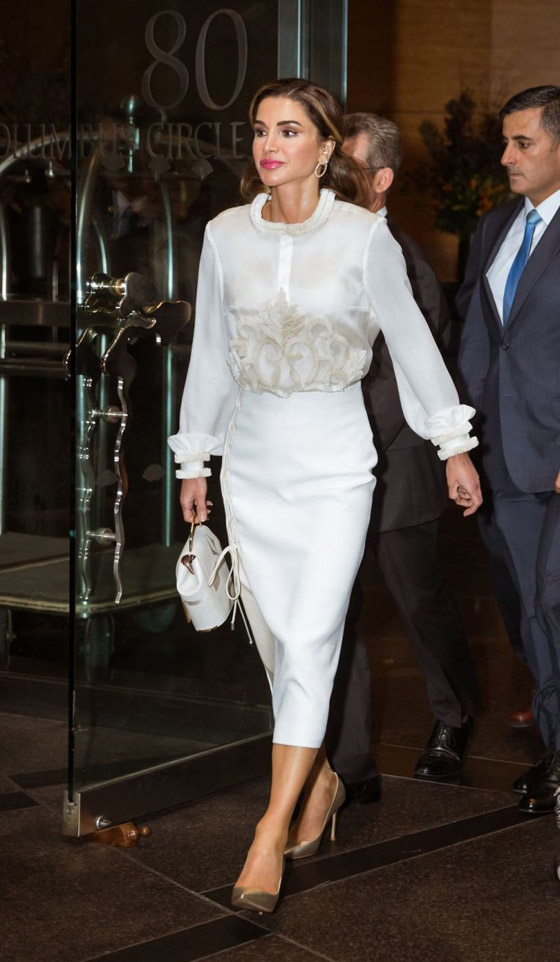 - في لقاء مع الداعمين لمؤسسة "نهر الأردن" في أميركا، اختارت الملكة فستاناً من تصميم حسين بظاظا.