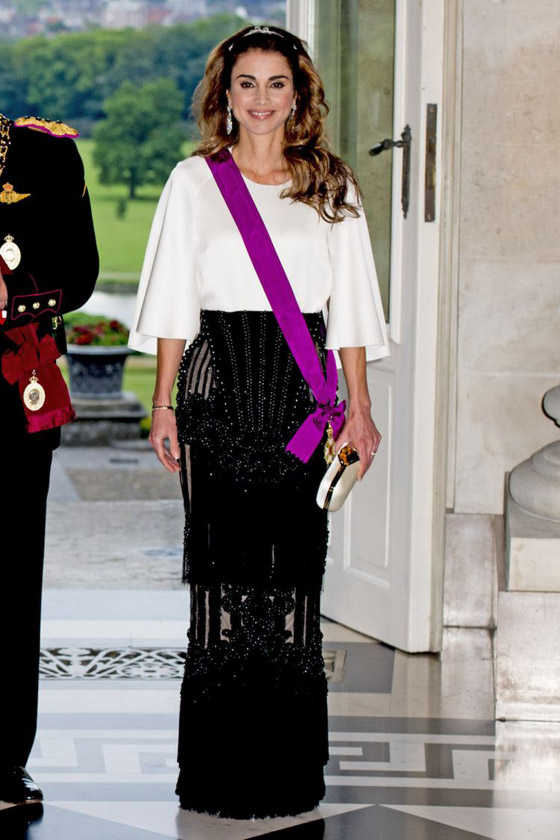 - في العشاء الرسمي في اليابان، الملكة بتصميم من توقيع الأردنية سهاد خواجة وحقيبة يد من تصميم الأردنية فرح أسمر.