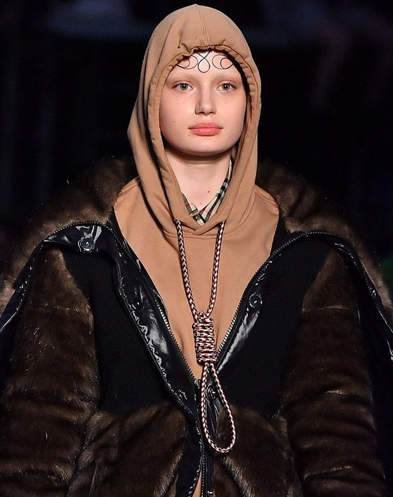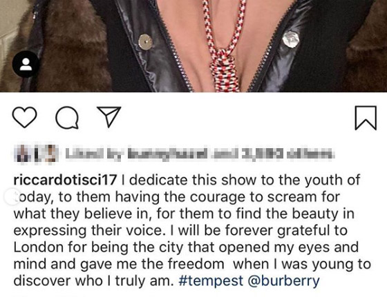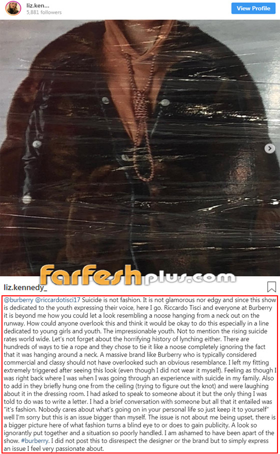 وظهر التصميم الجدلي ضمن مجموعة أزياء جديدة لـ "بربيري"، أسمتها "العاصفة"، في عرض أزياء حدث ضمن أسبوع لندن للموضة، وأهداه مصمم أزياء الشركة الشهير، ريكاردو تيشي، لـ "شباب اليوم". كما كتبت كينيدي لمتابعيها على إنستغرام: "كيف يمكن لشخص تجاهل هذا التصميم والاعتقاد أنه على ما يرام؟ خاصة أن العرض مقدم للشباب والشابات اليافعين".