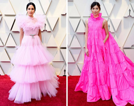 • أطلت المغنية ومؤلفة الأغاني المريكية، كاسي موسغريفز (يسار) والممثلة البريطانية جيما تشان، في فستانين مميزين بلون وردي، وهو اللون الذي طغى على الحفل.