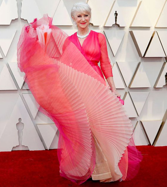 • استعرضت الممثلة هيلين ميرين تدرجات من اللونين الوردي والأحمر في حافة فستانها الذي تميز بغناه اللوني وتدرجات الألوان فيه. وتحمل ميرين لقب "ديم" أو "سيدة" وهو المعادل النسائي للقب "فارس" الذي تمنحه ملكة بريطانيا لأصحاب الإنجازات الهامة.