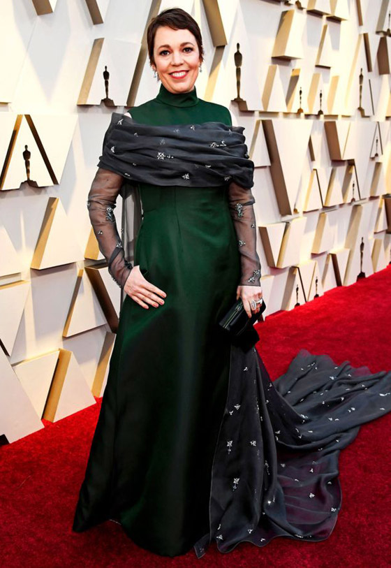• ظهرت أوليفيا كولمان، الفائزة بجائزة أفضل ممثلة عن أدائها لدور الملكة آن في القرن الثامن عشر، في إطلالة وصفت بالملكية بفستان أخضر مميز.