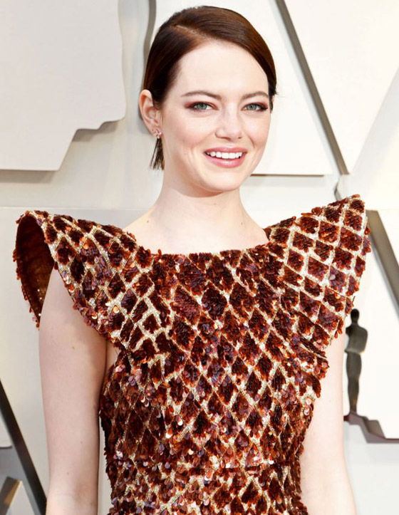 • ظهرت إيما ستون، المرشحة لجائزة أفضل ممثلة مساعدة عن فيلم "المفضلة"، في فستان يعكس مظهرا قويا بأكتاف بارزة.