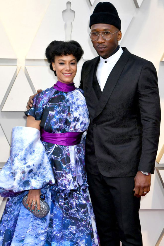 • سار ماهرشالا علي، الفائز بجائزة أوسكار أفضل ممثل مساعد، على السجادة الحمراء برفقة زوجته أماتوس سامي-كريم.