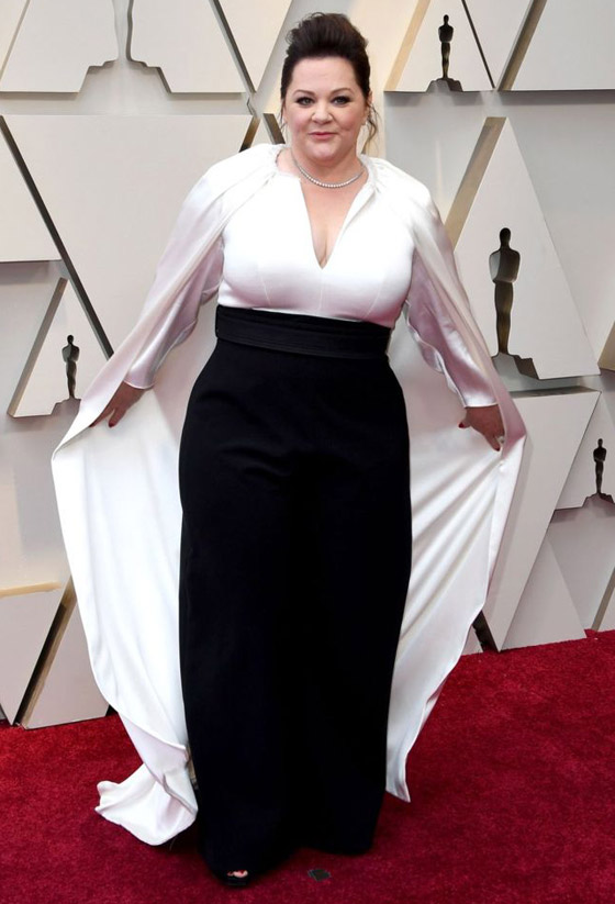 • ظهرت ميليسا مكارثي، المرشحة لجائزة أفضل ممثلة عن دورها في فيلم "أيمكنك أن تسامحني؟"، على السجادة الحمراء وهي ترتدي وشاح أبيض فوق فستان أسود.