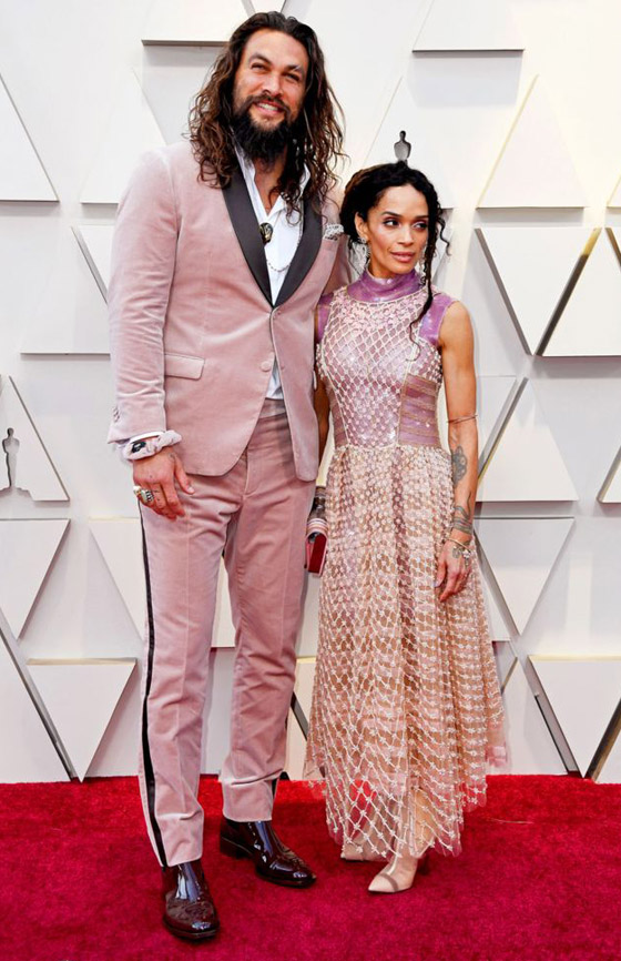 • ارتدى جيسون موموا، وليزا بونيت زيين متناغمين تدرجا بين اللونين الوردي والبنفسجي. كما جذبت الإسوارة التي ارتداها موموا انتباه المصورين بتصميمها الغريب.