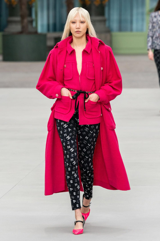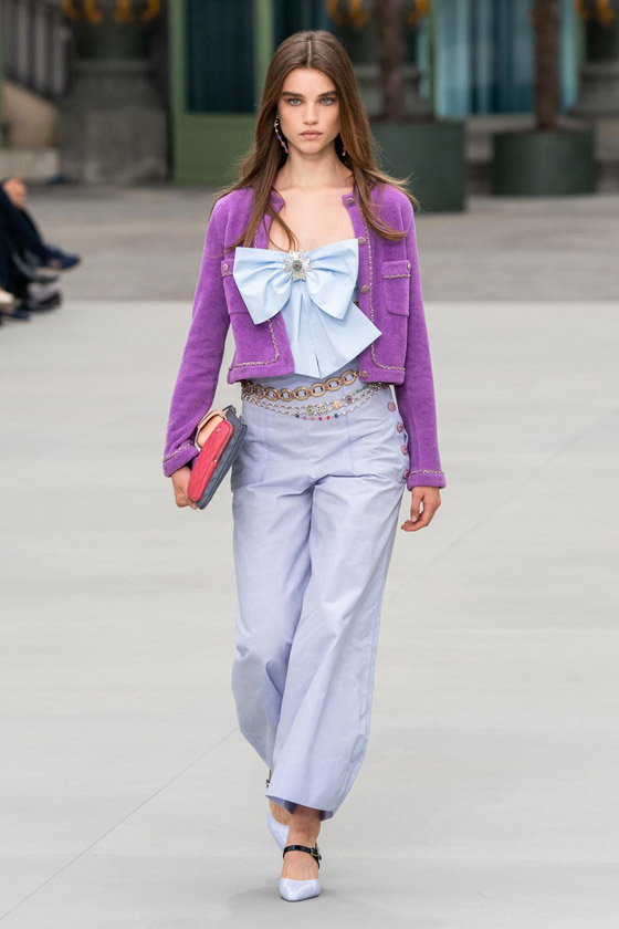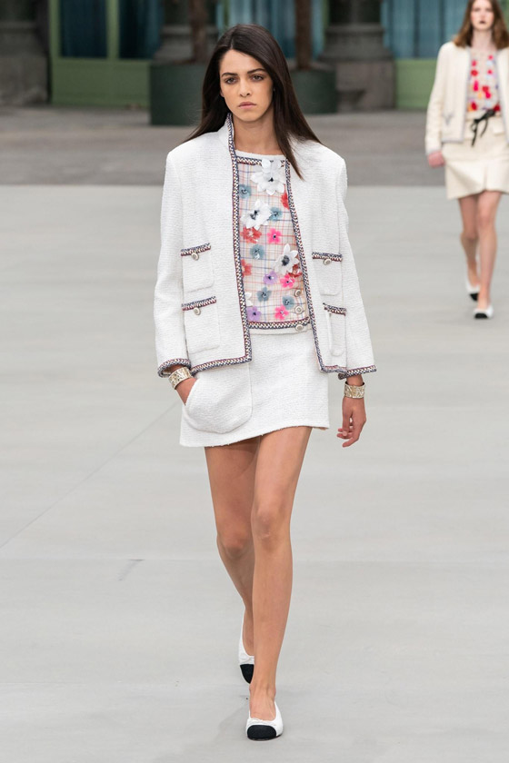 افتُتح العرض بمجموعة من البدلات ومعاطف "الترنش" ذات الألوان المحايدة لتليها إطلالات تزيّنت بالنسيج الصوفي المخطّط. وقد قامت فيرجيني فيارد بتنسيق سترة التويد الأيقونيّة مع سروال الليغينغ الذي تزيّن بطبعة الأحرف التي تؤلّف كلمة Chanel.قماش التويد تحوّل أيضاً إلى أثواب، وبدلات، وتايورات غلبت عليها حياديّة الرمادي كما ظهرت خامة الجلد التي تمّ تنفيذها على شكل سروال واسع، أو "جامبسوت"، أو حتى معطف. وقد تجلّت كلّ رقة الألوان الباستيلية في تصاميم غلب عليها اللون الأزرق الفاتح أو تزيّنت بطبعة مبتكرة أخذت شكل مربّعات ذات طابع مستقبلي.
