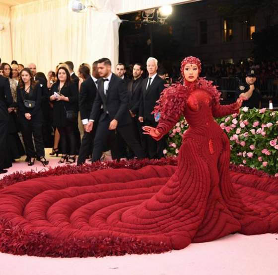 - تميّز ثوب مغنية الراب كاردي بي بضخامته. وقد حمل توقيع دار Thom Browne، فيما جاء أكسسوار الرأس من تصميم Stephen Jones. وقد ترافق ثوبها مع ذيل بطول 10 أقدام فيما تمّ تطريزه بحوالي 30 ألف ريشة.