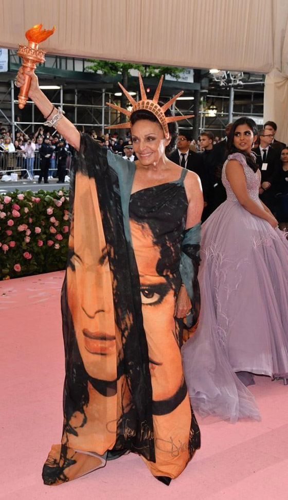 - اعتمدت المصممة ديان فون فيرستنبرغ إطلالة تجسّد تمثال الحريّة. وقد طبعت صورتها الشخصيّة على الثوب الذي ترتديه.