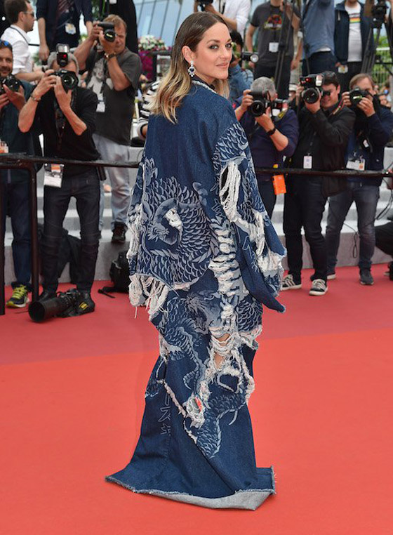 حاولت النجمة الفرنسية ماريو كوتيارد Marion Cotillard أن تختار اطلالة مختلفة على السجادة الحمراء، لكنّ خيارها لم يكن موفقًا أبدًا، وبدا اللوك غير مناسب للحدث، وكان عبارة عن كيمونو طويل مزركش برسومات آسيوية من "بالمان" Balmain نسقت من تحته شورت وتوب قصيرة باللون الأسود.
