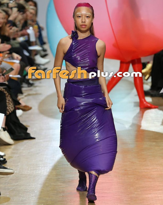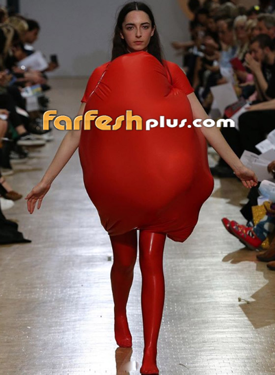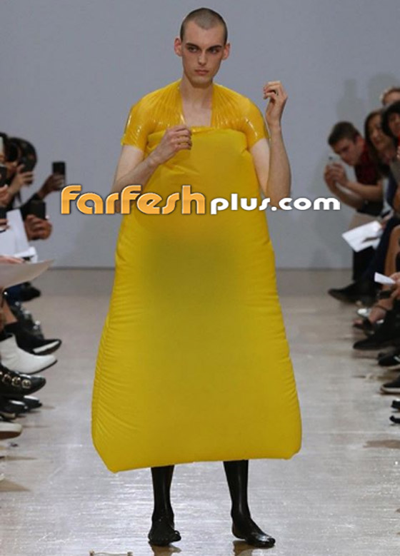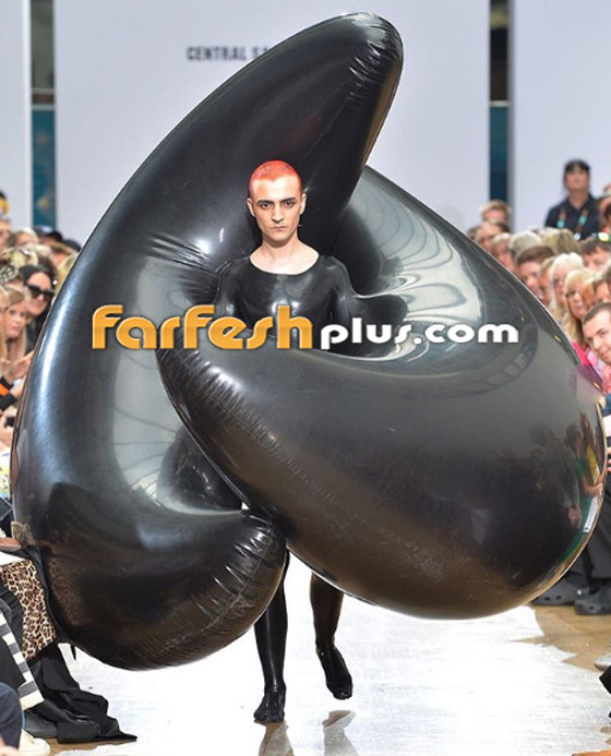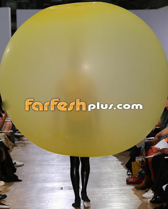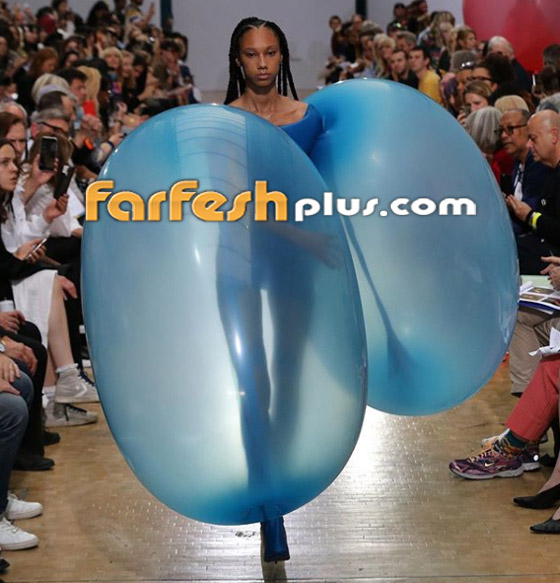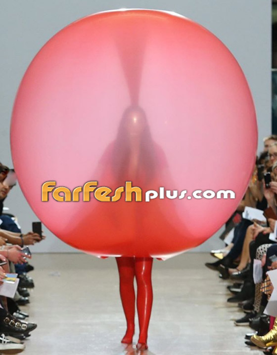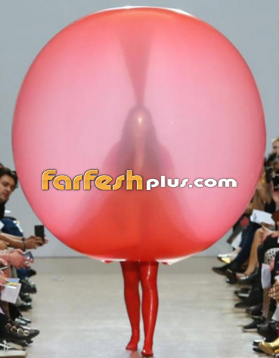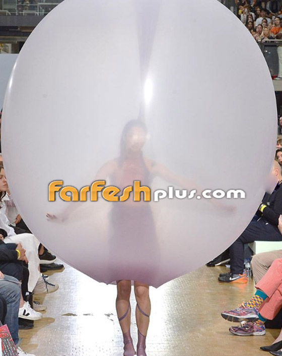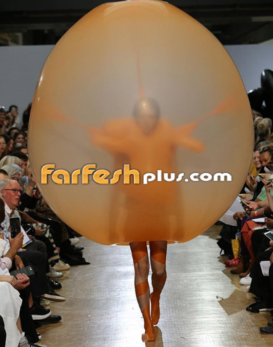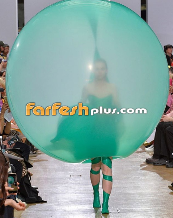 ولم يقتصر العرض فقط على العارضات، إذ يمكنك أن ترى عارضين رجال داخل بالونات ملونة ومصنوعة من المطاط الطبيعي. ومن خلال الفيديوهات التي نشرها المصمم عبر حسابه الرسمي على موقع "إنستغرام"، يمكنك أن تلاحظ كيفية تحضير العارض لنفسه، وكأنه يعيد ارتداء البالون لحظة تفريغه أمام الحاضرين.