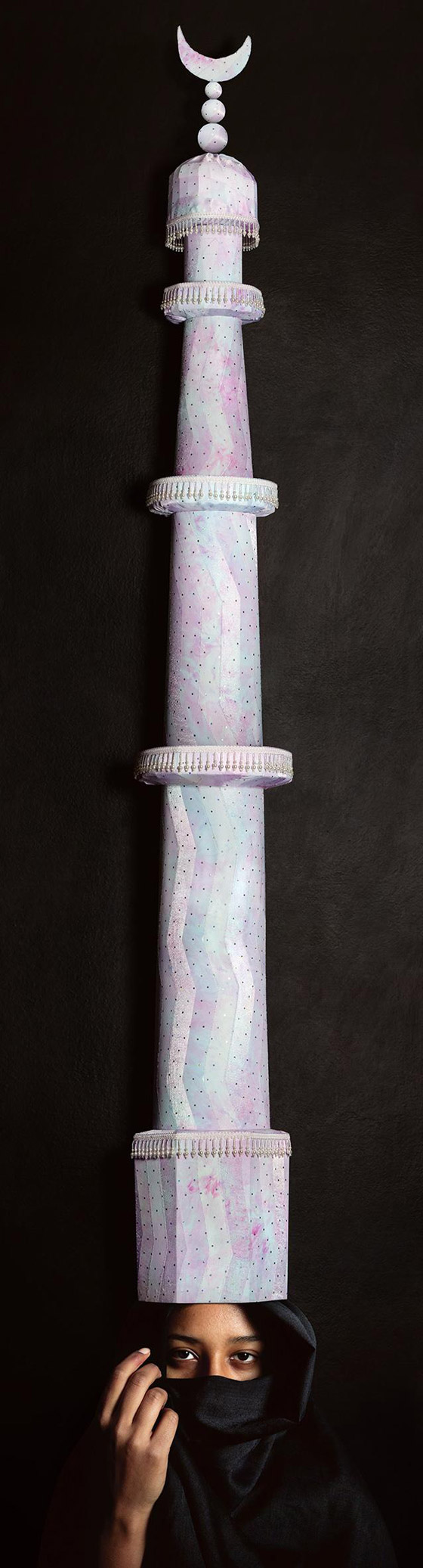 وتركز سلسلتها على منطقة الرأس، فهي تغطي الشخصيات في صورها بسلسلة من القبعات الطويلة والنحيفة على شكل مآذن. ووفقاً للفنانة، تجسد القبعات قلاعاً تحمي الرأس، وأما مجازياً، فهي تجسد اتجاهاً يجب على الإنسان أن يلجأ إليه باستمرار، وهو اتجاه "روحاني، وإسلامي بشكل خاص"، بحسب ما قالته. وتهدف المآذن أيضاً إلى تجسيد هوائيات تنقل الطاقة الروحية، وفقاً لما قالته الفنانة.
