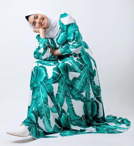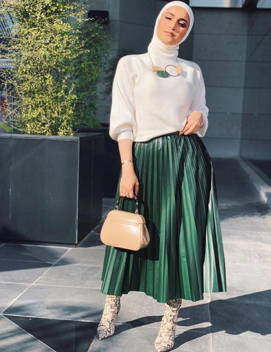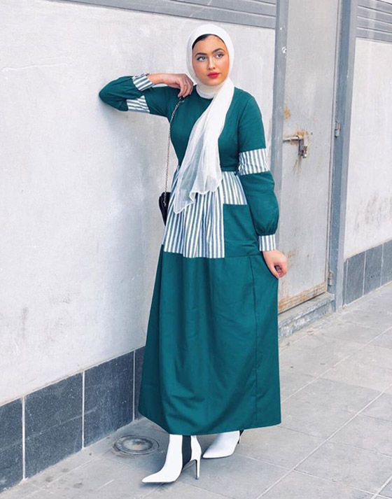 يمكنك اختيار أحد الفساتين الأنثوية بهذا اللون، كهذا اللوك من الفاشنيستا مريم حسن، مع خطوط بسيطة على الخصر والأكمام بلوني الأخضر مع الأبيض، وقد نسقت معه بوت الكاحل الأبيض، وطرحة بيضاء، وهو من الألوان التي ننصحك باعتمادها بقوة مع درجة الأخضر ، لتمنحك إطلالة ملائكية أكثر.