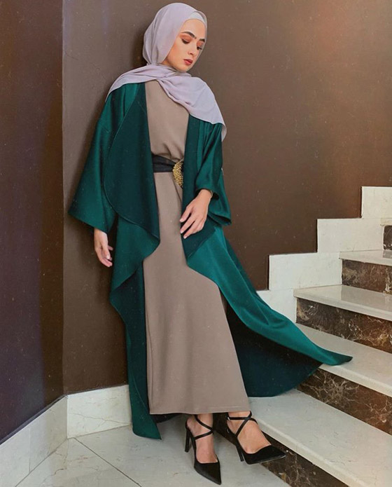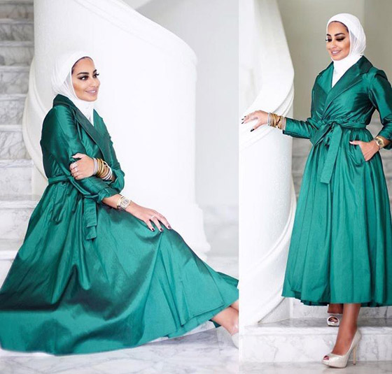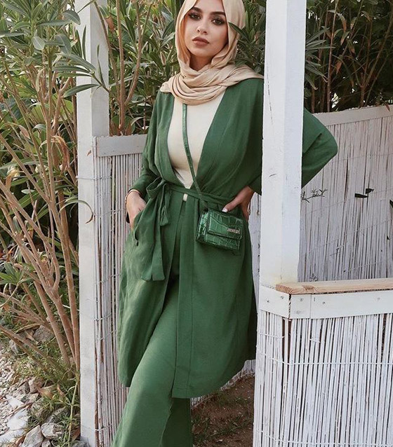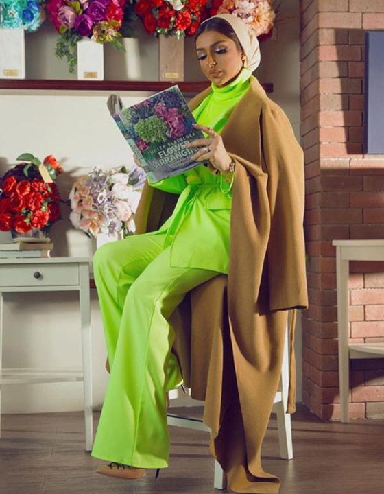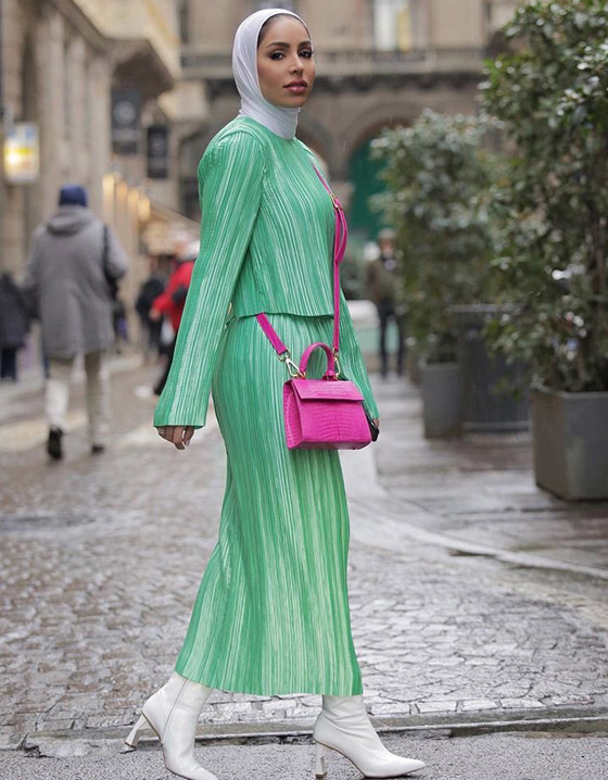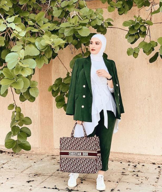 أما إذا كنت تفكرين في إطلالة آخر موضة، ومستوحاة قليلا من أجواء الخريف القادمة، فإليك هذا التايور من الفاشنيستا دلال النقبندي، باللون الاخضر الباهت مع التكسيرات البيليسيه، نسقت معه شنطة فوشيا للمسة مبهجة، وبوت الساق الأبيض، مع الطرحة المعتادة من ذات اللون.