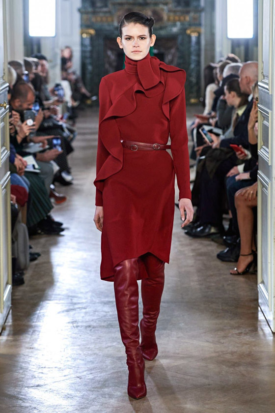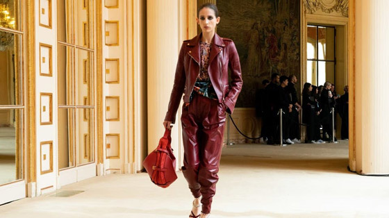 اللون الأحمر الداكن نشر دفئه على العديد من الإطلالات. وقد زيّن السترات والسراويل الجلديّة لدى Altuzarra والأثواب المزيّنة بالكشاكش لدى Elie Saab كما رأيناه يزيّن المعاطف لدى Chanel.