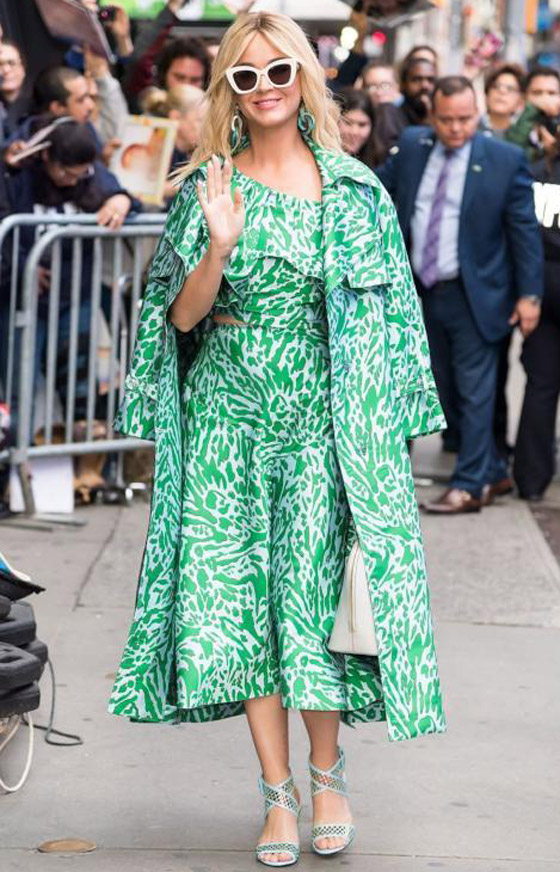 كايتي بيري في اطلالة معرقة باللونين الأخضر والأبيض