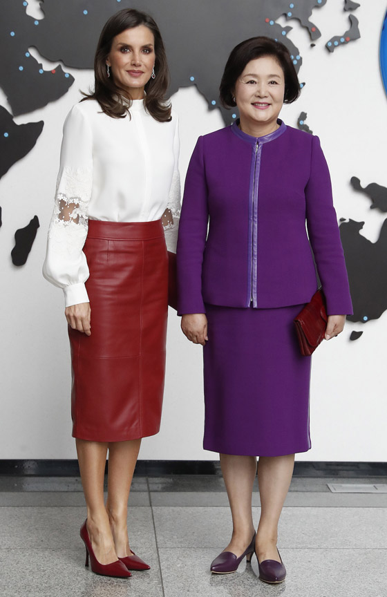 وارتدت الملكة التنورة الجلدية باللون الأحمر الماروني أو ما يُعرف بالكستنائي من توقيع هيوغو بوس مع بلوزة بيضاء أنثوية ذات أكمام منتفخة مطرزة من كارولينا هيريرا، وأكملت إطلالتها بحذاء ستيليتو وحقيبة يد باللون عينه، فبدت أنيقة وجميلة وذلك أثناء تواجدها في كوريا الجنوبية.