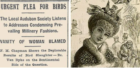 طيور في القبعة: تسبب ظهور تلك الموضة المخيفة، في تراجع تام في أعداد الطيور، إذ كان وضع ريش الطيور أو حتى أجسادها كاملة بداخل القبعات من الأعلى، يعتمد على اصطياد أعداد كبيرة منها لهذا الغرض، الذي رفضه الكثيرون فلم يستمر طويلا.