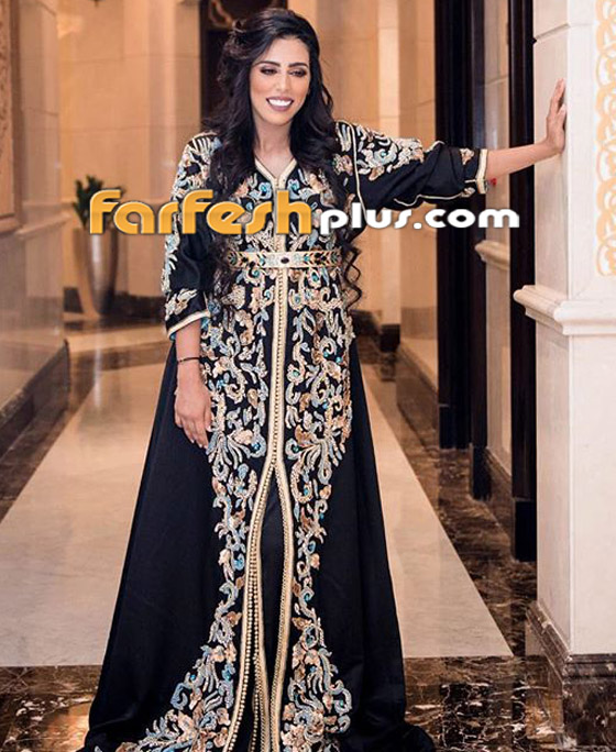 - هدى سعد بقفطان أسود مزركش: اعتمدت هدى سعد قفطانًا باللون الأسود مزركشًا ومطرزًا بالخرز الكريستالي اللامع، أنيقًا مع فتحة الساق المبطن بلون مختلف، اختارت معه تطريزًا لحزام الخصر بسيطًا غير محكم للغاية، لكنه فقط يُبرز منحنيات الجسم قليلًا. هذا الموديل مع تطريزاته البسيطة ربما يناسب أكثر الصبايا الممتلئات، بخاصة من ناحية البطن، لأنّ الحزام الواسع يخفي هذا العيب.