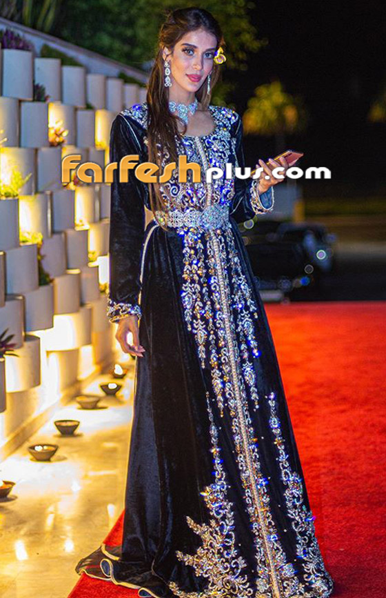 - القفطان الفخم من كريمة جويت: في المقابل ارتدت كريمة جويت غيث القفطان الأسود بلمسة أكثر فخامة وترفًا، مع التطريزات اللامعة الكريستالية الملونة، وخامة الفيلفت المترفة، وأبرز فخامة الفستان أكثير اعتمادها للمجوهرات الماسية مع العقد، والأقراط الثمينة التي أكملت الاطلالة المترفة.