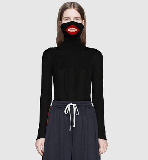 1. كنزة "الوجه الأسود" - دار "غوتشي": إنتقادات كثيرة تعرضت لها هذه العلامة التجارية الإيطالية الشهيرة بسبب مجموعة من الإطلالات المثيرة للجدل، والتي بدأت في شباط، عندما أصدرت سترة سوداء طويلة العنق، يمكن سحبها إلى منطقة العيون، لتظهر شكل أحمر شفاه واسع حول منطقة الفم؟ واعتبر النقاد إنها تشبه ممارسة "الوجه الأسود"، وهي طريقة كان يستهزئ بها أصحاب البشرة البيضاء من الأفارقة أثناء تقديمهم لعروض موسيقية، باستخدام الطلاء الأسود والقيام بتعابير وجه مبالغ بها، كالشفاه الحمراء.
