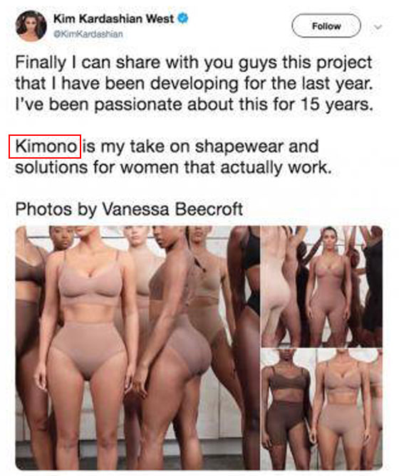 4. خط الملابس الداخلية " كيمونو" - كيم كارداشيان: تعرضت كيم كارداشيان للاتهامات والانتقادات في حزيران بعدما أعلنت عن إطلاق خط الملابس الداخلية "كيمونو". واعتبر البعض استخدام كلمة "الكيمونو" إهانةً للثوب الياباني الوطني. وبعد يومين من الإعلان، أثارت العلامة التجارية جدلاً على موقع التواصل الاجتماعي "تويتر" بهاشتاغ #KimOhNo وفي البداية دافعت كارداشيان عن اختيارها للاسم قائلة إنها "إشارة إلى جمال وتفاصيل" الملابس اليابانية التقليدية، ولكنها في النهاية رجعت عن قرارها، ونشرت عبر صفحتها على موقع "انستغرام"، في آب، لتقول إنها أعادت تسمية العلامة التجارية لتصبح Skims Solutionwear.