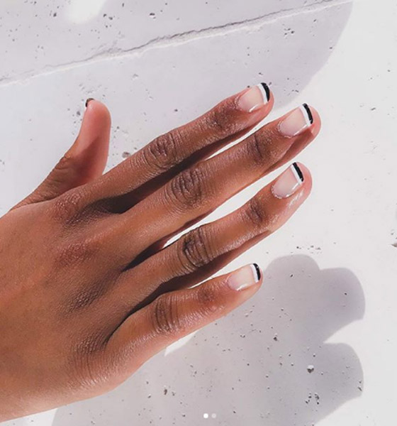 الفرينش: تعتبر موضة الأظافر البيضاء التي تُسمى ب " الفرنش " موضة لا تبلى على مر السنوات فهي أكثر موضة مناسبة للأظافر وخاصة القصيرة ولكن مع إضافة لمسات بسيطه وهو إضافة خط أسود مع الخط الأبيض الرئيسي بشكل متوازن بين اللونين الأبيض والأسود.