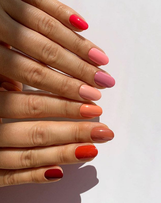 الألوان المتدرجة: للحصول على هذه الموضة يجب عليكي إختيار خمس الوان من مجموعة واحده للحصول على لوحة فنية متدرجه على أظافرك.