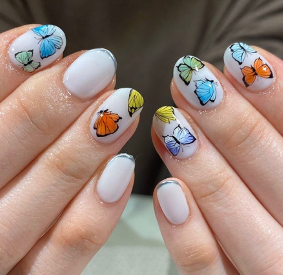 الفراشة: يمكنك تطبيق هذا الاتجاه بسهولة للغايه بطلاء اظافرك بالكامل باللون الأبيض مع رسومات صغيرة للفراشات الملونة وهذه الموضة ملائمة لفصل الصيف والرحلات إلى الشواطئ.