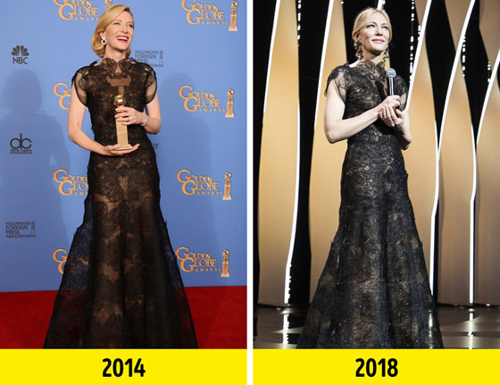 1. كيت بلانشيت: ارتدت ممثلة هوليود نفس الملابس مرتين في حفل السجادة الحمراء، إذ ارتدت فستانا رائعا في حفل جولدن جلوب في يناير 2014، وبعد 4 سنوات، ظهرت بنفس الفستان في مهرجان "كان".