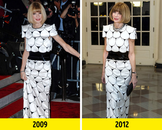 2. أنا وينتور: رغم كونها مهتمة بالموضة، فإن محررة Vogue وإحدى أكثر الشخصيات نفوذاً في عالم الأزياء غالبا ما ترتدي ثيابها مرتين. في عام 2012 خلال حفل استقبال رئيس الوزراء البريطاني، كانت ترتدي الزي الذي ظهرت به أيضًا منذ 3 سنوات في حدث Met Gala.