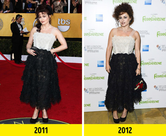 3. هيلينا بونهام كارتر: نظرًا لأن هذه الممثلة لها ذوق مختلف، فإن كل ظهور لها يعطي انطباعاً لا يُنسى، وفي عام 2012 في مهرجان لندن السينمائي، كانت ترتدي الفستان نفسه الذي كانت ترتديه قبل عام، مع تصفيفة شعر وإكسسوارات مختلفة.